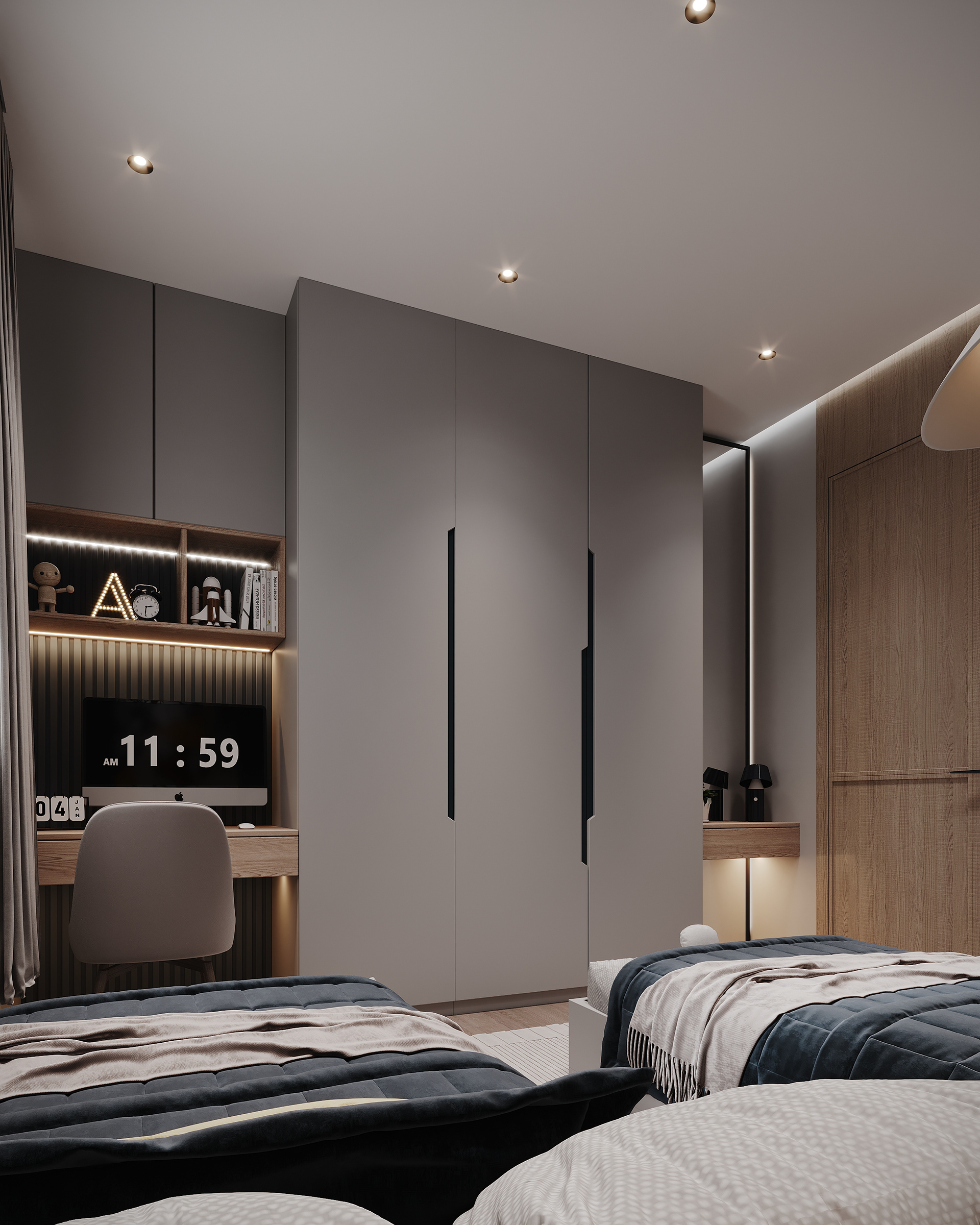 - Wardrobe: Tall seamless matte grey doors with slim black vertical handles – push-to-open mechanism, tons of internal hanging & shelf space.