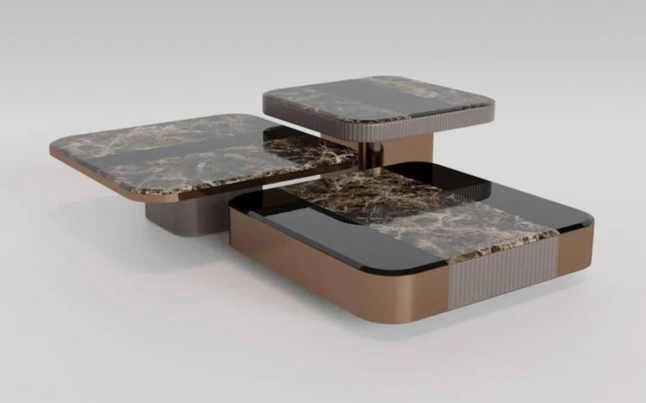A masterpiece of modern luxury – this three-piece nested centre table set features rich Emperador dark marble tops with dramatic natural veining, paired with polished bronze stainless-steel frames and textured ribbed detailing. The unique staggered, overlapping design allows flexible arrangement while creating a bold sculptural presence.