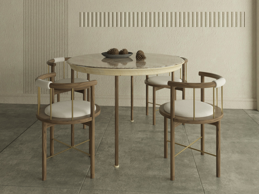 Pure Nordic-Japandi elegance – a stunning round marble-top dining table with natural creamy veining, resting on a solid walnut wood base with subtle gold metal accents. Paired with 4 designer walnut dining chairs featuring curved backrests, soft cream leather cushions, and delicate gold metal cross-bracing for that perfect blend of warmth and sophistication.