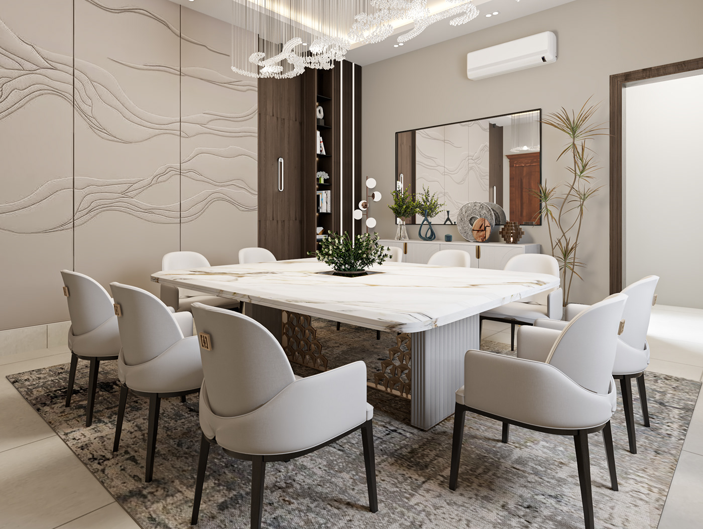 • Backdrop: 3D textured wave wall panels in soft beige + built-in dark wood display unit.
